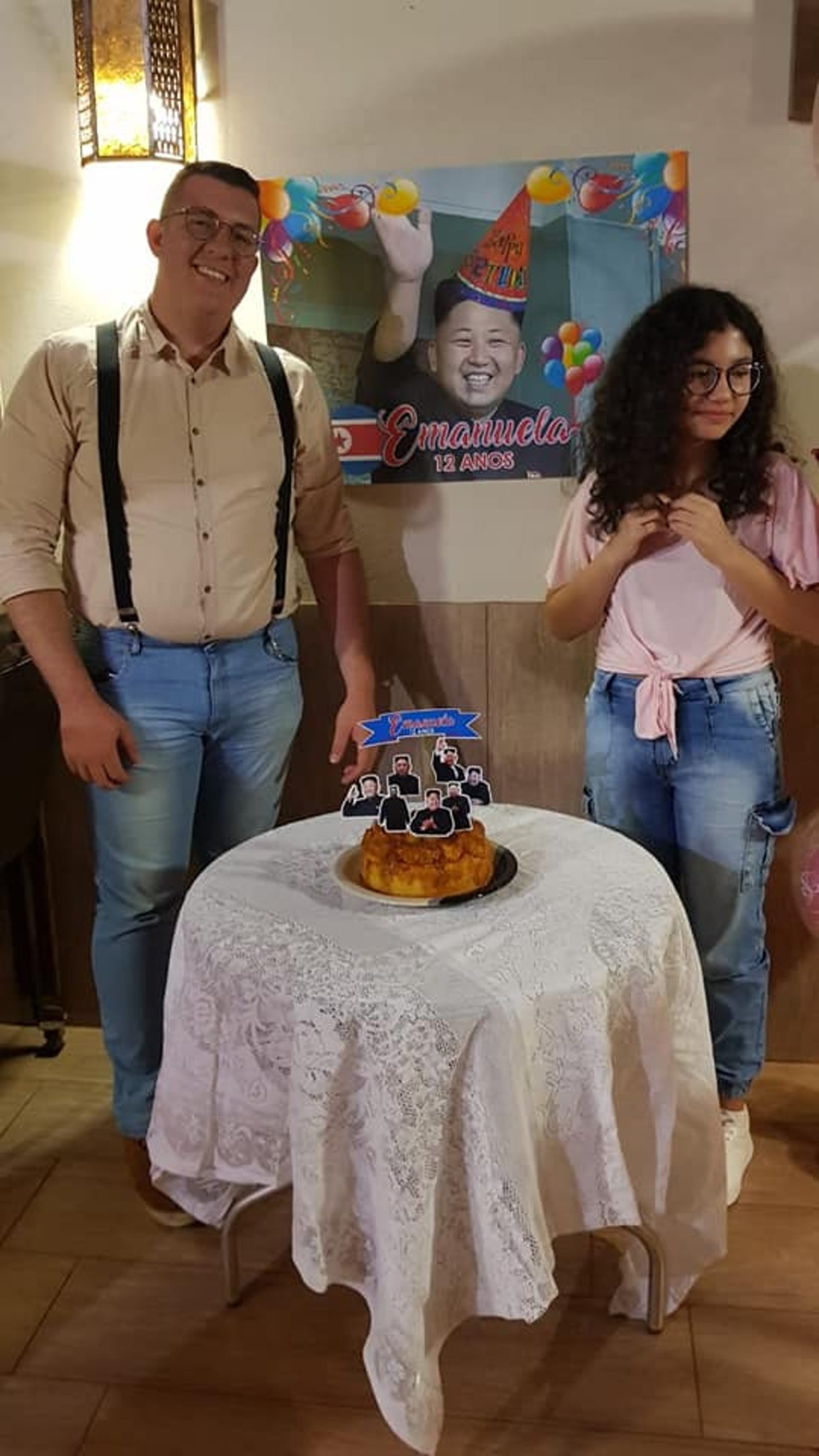 ▼Vitor搜索到的「最有名的韓國人」並不是大明星,而是朝鮮領導人金正恩!妹妹心心念念在生日派對上看到BTS的海報,沒想到生日當天竟然收到了金正恩的海報。Vitor挑選了一張金正恩一臉笑容揮手的照片,並給他戴了一頂朝鮮國旗顏色的帽子,還在海報周圍補上一些氣球。蛋糕也是金正恩主題的,Vitor準備的蛋糕看起來很樸素,但上面放了金正恩的表情包,足足有7個金正恩,就像一個男團一樣。