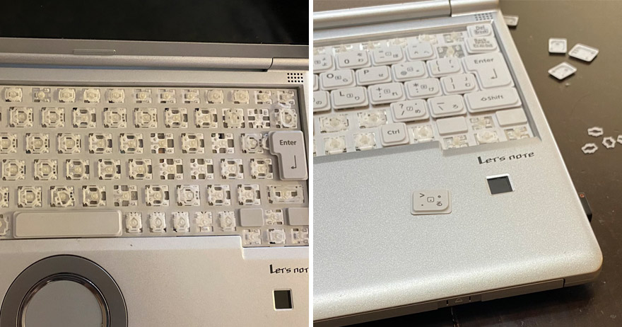 ▼原來女兒趁爸媽不注意,獨自玩耍時將筆電的鍵盤按鍵全拔光了。爸爸非常無奈,他還要用筆電工作,只好在早上上班進行視訊會議之前,趕緊把按鍵恢復原狀。