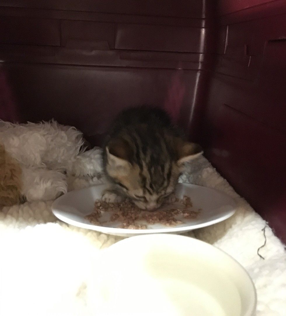 國外網友Sharra Platt養了一隻大狗Roxy,她本來沒想再養其他寵物,沒想到緣分自己找上門~那天她下班回家時,看到一對母女一臉擔心地看著一隻小貓。Sharra連忙停車上前關心,那對母女告訴她,這好像是一隻孤兒浪貓,附近沒有看到牠媽媽的身影。當時天已經黑了,環境又不安全,Sharra實在不忍心將小貓孤零零留下,就決定把牠帶回家。