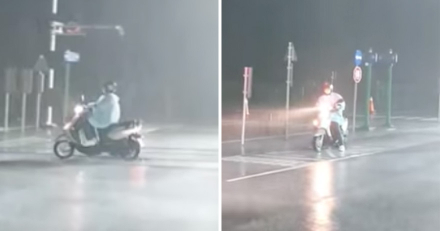 ▼從影片中可以看到,當時天色已晚,正下著大雨,還有強大的風勢,一名女騎士身穿雨衣,在機車駕訓場地冒著傾盆大雨努力練習機車。因為颱風軒嵐諾的影響,外圍環流帶來強大風雨,雨勢已經大到快要看不見路,女騎士仍淡定練車,轉彎前還認真做出左右擺頭察看來車的動作,碰到斑馬線標示也會停下來,禮讓路人通行。