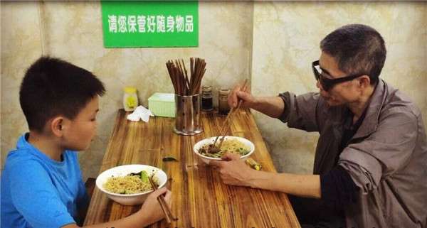 ▼某天的下午,麵店裡客人很少,老闆看到一個小男孩背著書包,扶著失明的爸爸進到店裡,兩人的衣著打扮很樸素,看起來家境不是很好。小男孩先找位子讓爸爸坐好,然後一個人跑來櫃台點菜。