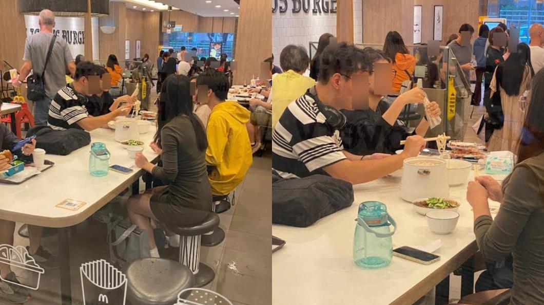 原po在臉書社團「將軍澳主場」上傳一張照片,從照片中可以看到,5名男女在麥當勞內自如地煮麵、分食。男子將麵條從電煮鍋夾出分裝到碗內,另外2名女子則熟練地拿出餐具。桌上除了煮好的麵食外,還有其他小菜。他們完全沒有購買任何麥當勞餐點,整個場景宛如置身於自家餐廳。