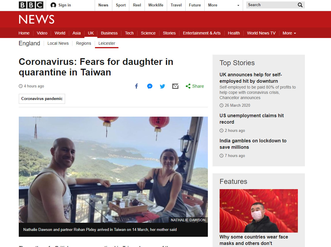 根據英國BBC報導,有兩個來自英國的旅客在3月初的時候抵達台灣,因為剛好遇上新冠肺炎疫情爆發,他們被告知必須進行居家疫檢14天,這兩個英國旅客本來是想要在原來住的民宿隔離,但因為沒錢,隨後就被載往安置隔離的檢疫中心,結果他們說被隔離的地方就像監獄一樣,「被鎖在裡面,出不去」、「有人一天幫他們送三次食物,但品質很差,份量也很少」、「房間很髒,他沒有熱水也沒辦法洗衣服」,感覺台灣真的虧待他們。
