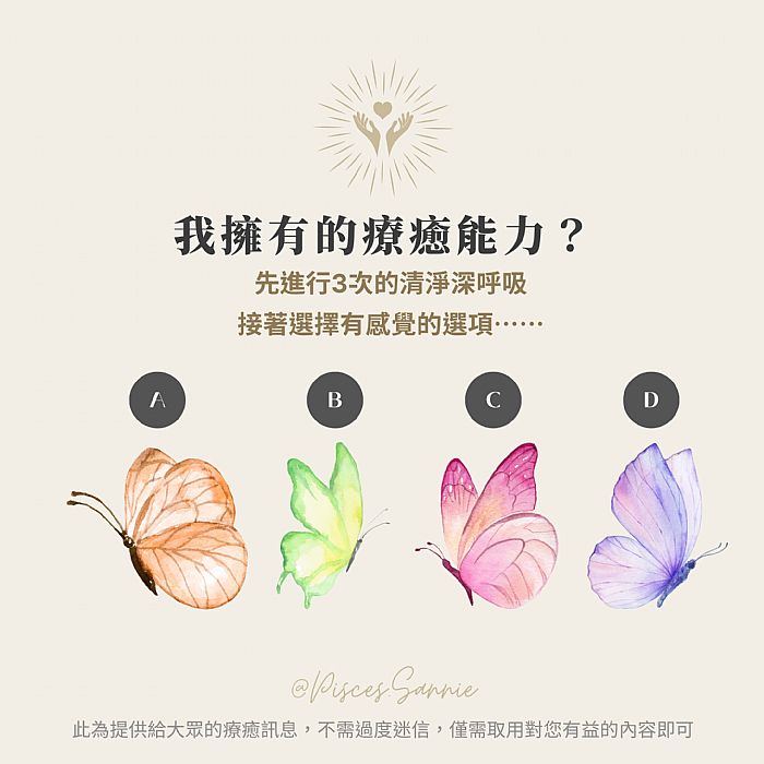 憑感覺選擇一隻蝴蝶,見證你的療癒能力!我們每個人都自帶療癒能力!來看看你的療癒能力是什麼?請先進行 3 次的清淨深呼吸,選擇你有感覺的蝴蝶