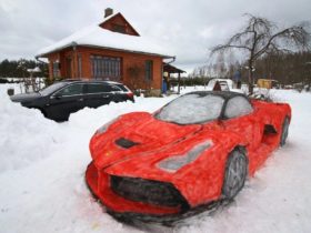 好想買跑車! 夫妻在前院雪雕「破億法拉利超跑」 網友膜拜:買不起就自己造!