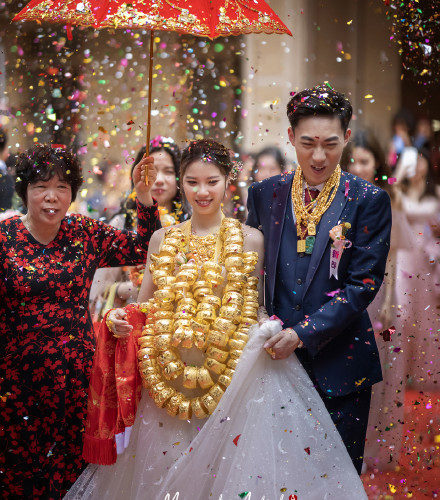 按照廣東的習俗,晚輩結婚時長輩會送龍鳳手鐲代表祝福,新娘將這些手鐲掛在脖子上,是 ...